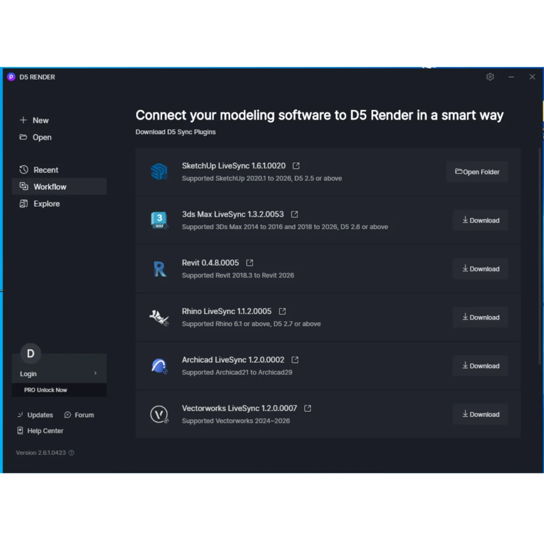 Seamless integration with major CAD platforms including SketchUp, 3ds Max, Revit, Rhino, Archicad, and Vectorworks. Direct connection from design software to D5 Render. Model updates automatically synchronized. Unified workflow from design to visualization. Professional integration supports all major platforms. Workflow seamless and efficient. Complete platform support ensured.
